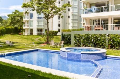 este apartamento se encuentra en una exclusiva torre de apartamentos con vista a la cancha de golf. Sala comedor con cocina totalmente equipada, dormitorio principal con walkin closet y jacuzzi, dos dormitorios secundarios comparten un baño. Balcón, con vista. Aire Acondicionado. dormitorio de servicio con baño, area de pilas, bodega, estacionamiento para 2 carros. Sala de eventos, gimnasio y piscina.